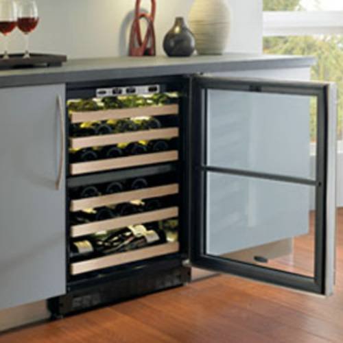 6SDZE-BB-G-L Hinge: Left, Door Finish: Black Glass Door Description • Features •Specifications Description The Dual Zone Wine Cellar offers the control, consistency and convenience needed to serve wine immediately at optimum temperatures and from two distinct zones. Each of the two zones is monitored by Marvel s exclusive Sentry System refrigeration monitor, allowing each to be set and maintained at precise temperatures. As a result, reds or whites are ready to serve at precise temperatures from either compartment. Back To Top Features -Stores up to 44 bottles: 24 in upper zone and 20 in lower zone . -Each zone can be set to a specific serving temperature for reds, whites or sparkling wines . - Each zone is monitored by Marvel s exclusive Sentry System refrigeration monitor to maintain precise temperatures. - Elegant blue LED display shows real-time temperature of wine in each zone . - Digital touch controls and display are discreetly located. - Temperature can be set between 40 to 65 F for either compartment and may be displayed in either Fahrenheit or Celsius . - The Sentry System provides notification in rare events of over/under temperature or door ajar conditions; visual alarm in event of power failure . - Message center displays system status. - Integral Sabbath Mode is user activated. - Glide-out wine racks hold all bottle shapes and fully extend at 90 door opening. - Clear, solid white maple facings on wine racks are perfect for custom finishing. - Optional shelf facings are available in stainless steel and gloss black. - Soft interior lighting in each zone can be set for showcase (continuous) mode or activated with door opening . - Dual-pane, tinted, UV-resistant glass door protects wine from harmful light . - Interior is Marvel s signature high gloss black . - Vibration Neutralization System offers triple layer protection against harmful vibration . - Ultra powerful compressor and forced air cooling with dual fans maintain stable temperatu